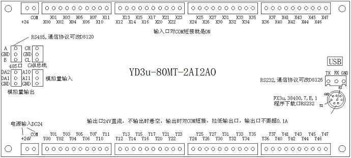 2个RS232(8芯通信口为FX3u协议38400,7,E,1;白色通信口通信协议可通过设定D8126变换,可切换为FX3u、Modbus Rtu、RS指令),1个RS485(通信协议可通过设定D8120改变,可改为FX3u协议或Modbus Rtu协议、RS指令以及变频控制指令)。1个CAN总线,用于连接远程IO模块或主机间自动通信。1个USB口用于程序下载,在线监控。