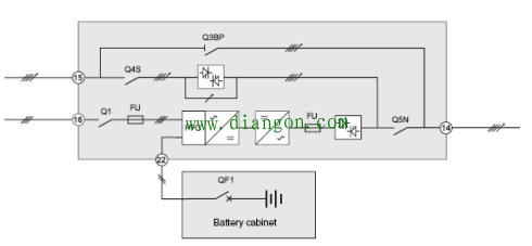 2、整流器之前的市电输入开关是(Q1)断开的(市电没有为UPS供电);