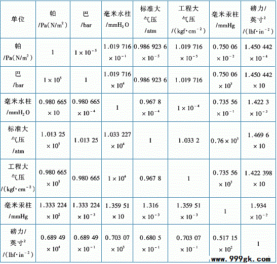 由于历史发展的原因、单位制的不同以及使用场合的差异,压力还有多种不同的单位。目前工程技术部门仍在使用的压力单位有工程大气压、物理大气压、巴、毫米水柱、毫米汞柱等。各种压力单位间的换算关系列于表1中。
